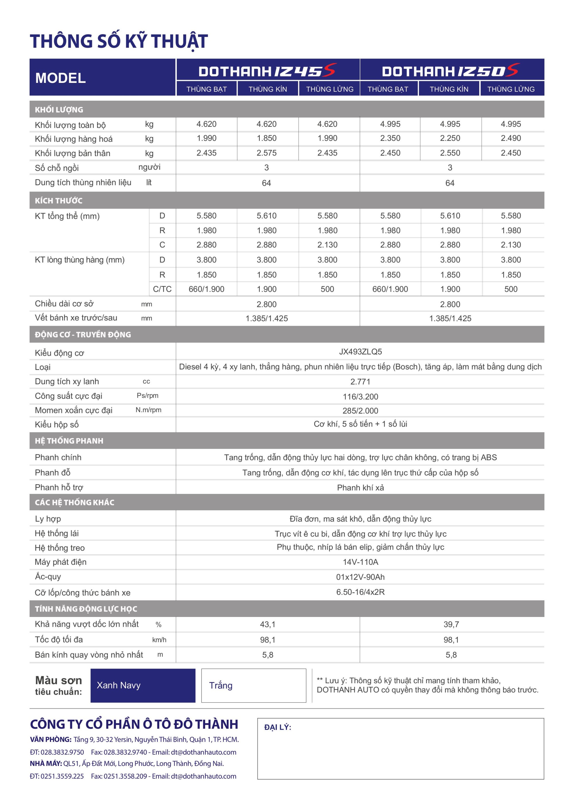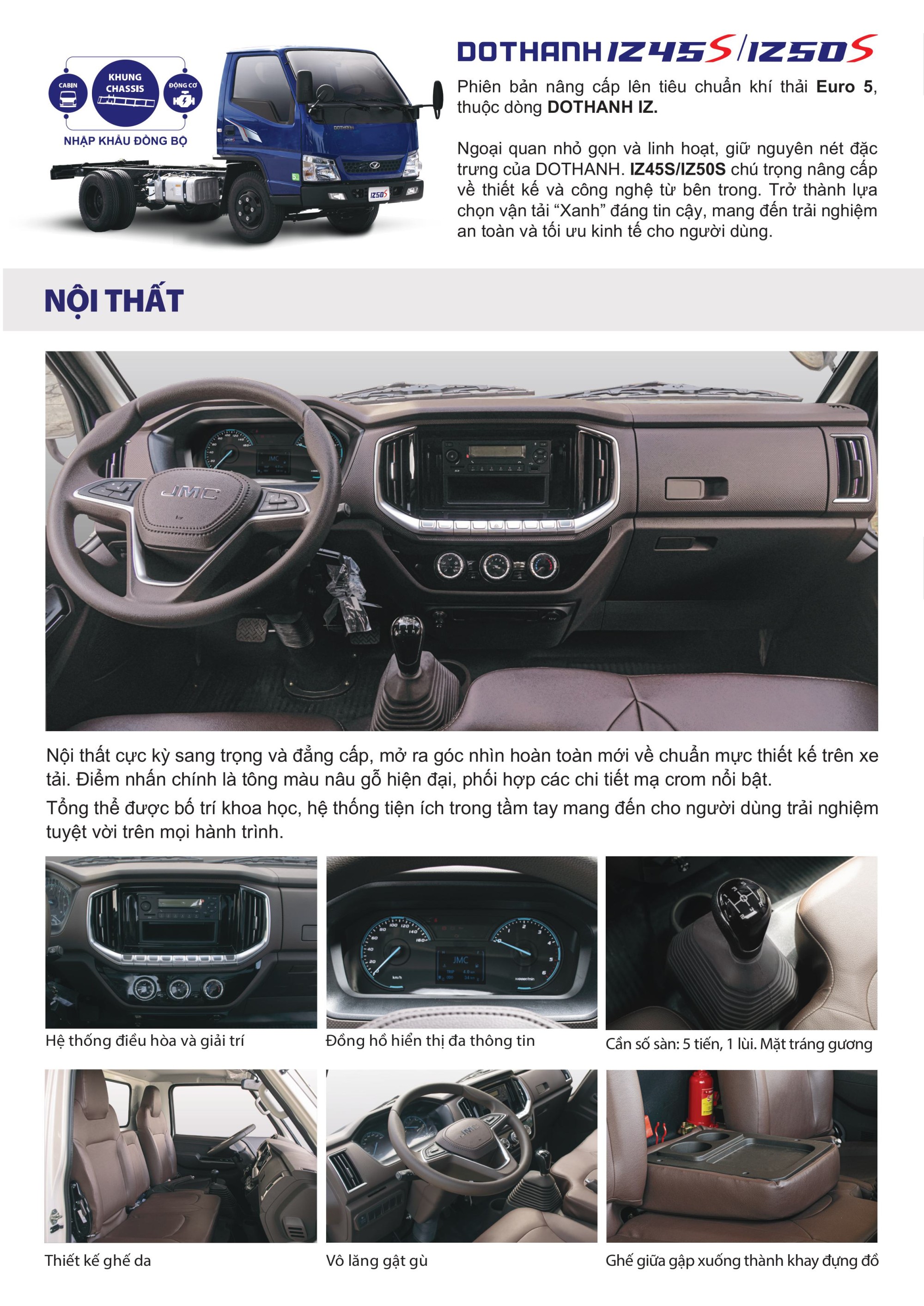 DOTHANH IZ45S và IZ50S là hai mẫu xe tải nhẹ đạt chuẩn Euro 5, thiết kế nhỏ gọn, linh hoạt, phù hợp vận chuyển hàng hóa nội thành và liên tỉnh. Cả hai đều thuộc dòng xe IZ Series mới của Đô Thành Auto, nổi bật với nội thất sang trọng, động cơ mạnh mẽ và tiết kiệm nhiên liệu.