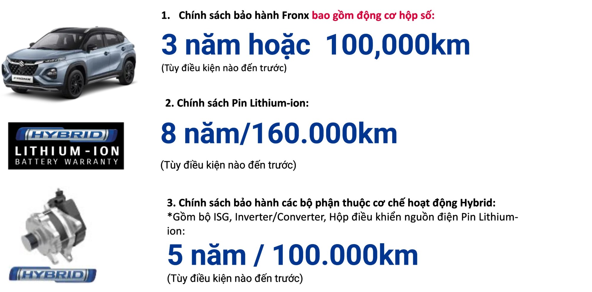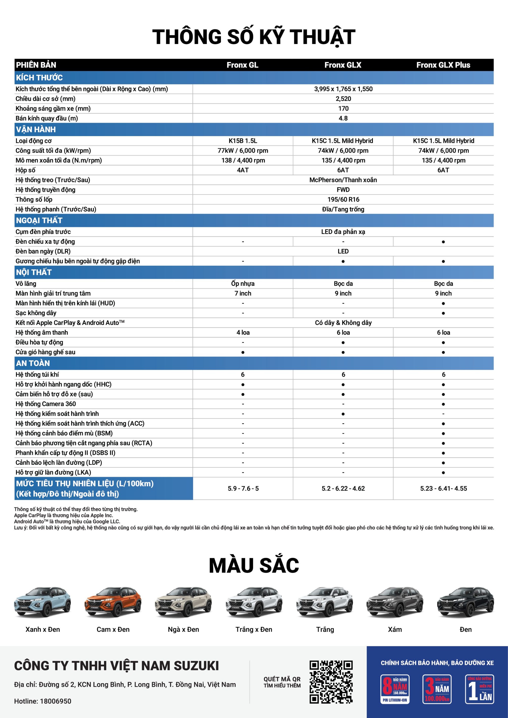 Mạnh mẽ mà thanh lịch - Fronx mang đến trải nghiệm lái khác biệt với thiết kế coupe năng động, động cơ K15C kết hợp hệ thống Hybrid SHVS, hộp số tự động 6 cấp 6AT cùng hệ thống ADAS – công nghệ hỗ trợ lái tiên tiến, giúp bạn tận hưởng sự khác biệt trong từng chuyển động.